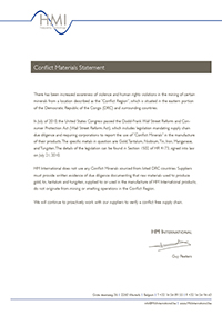 In July of 2010, the United States Congress passed the Dodd-Frank Wall Street Reform and Consumer Protection Act (Wall Street Reform Act), which includes legislation mandating supply chain due diligence and requiring corporations to report the use of “Conflict Minerals” in the manufacture of their products. The specific metals in question are: Gold, Tantalum, Niobium, Tin, Iron, Manganese, and Tungsten. The details of the legislation can be found in Section 1502 of HR 4173, signed into law on July 21, 2010. HM International does not use any Conflict Minerals sourced from listed DRC countries. Suppliers must provide written evidence of due diligence documenting that raw materials used to produce gold, tin, tantalum and tungsten, supplied to or used in the manufacture of HM International products, do not originate from mining or smelting operations in the Conflict Region. We will continue to proactively work with our suppliers to verify a conflict free supply chain.